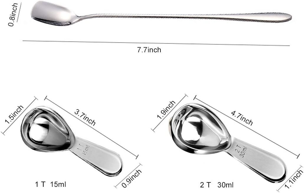 FeaturesNest For Storage Stainless Steel 18 / 8 (304) Dishwasher SafeEngraved MeasurementEasy To Clean 2 Pcs Coffee Measuring ScoopWater drop shape, short handleGreat measuring tool. Short handle that allows you to take it convenientlyIts sleek and glossy polish will surely compliment almost any kitchen theme. BPA Stainless Steel Durable coffee spoon dishwasher safe 4 Pcs Bar Mixing SpoonsCoffee Shop Stainless Steel Tea Spoons Scoops Porridge Silver Tonecoffee stirrers come with modern design and slender streamlined handle, which are easy to match with existing flatware.Perfect for home, office and restaurantSuitable to scoop up liquid food as soup and porridgeSuitable for mixing drinks like iced tea, ice coffee, milkshake SpecificationsMaterial : stainless steel 304Quantity : 6 piecesCapacity of the measuring Spoons : 1 bsp-15ml and 2 tbsp-30mlLength of the teaspoon:7.9 inch Package includes2 x Water drop shaped tablespoon Scoop4 x Long handled teaspoons