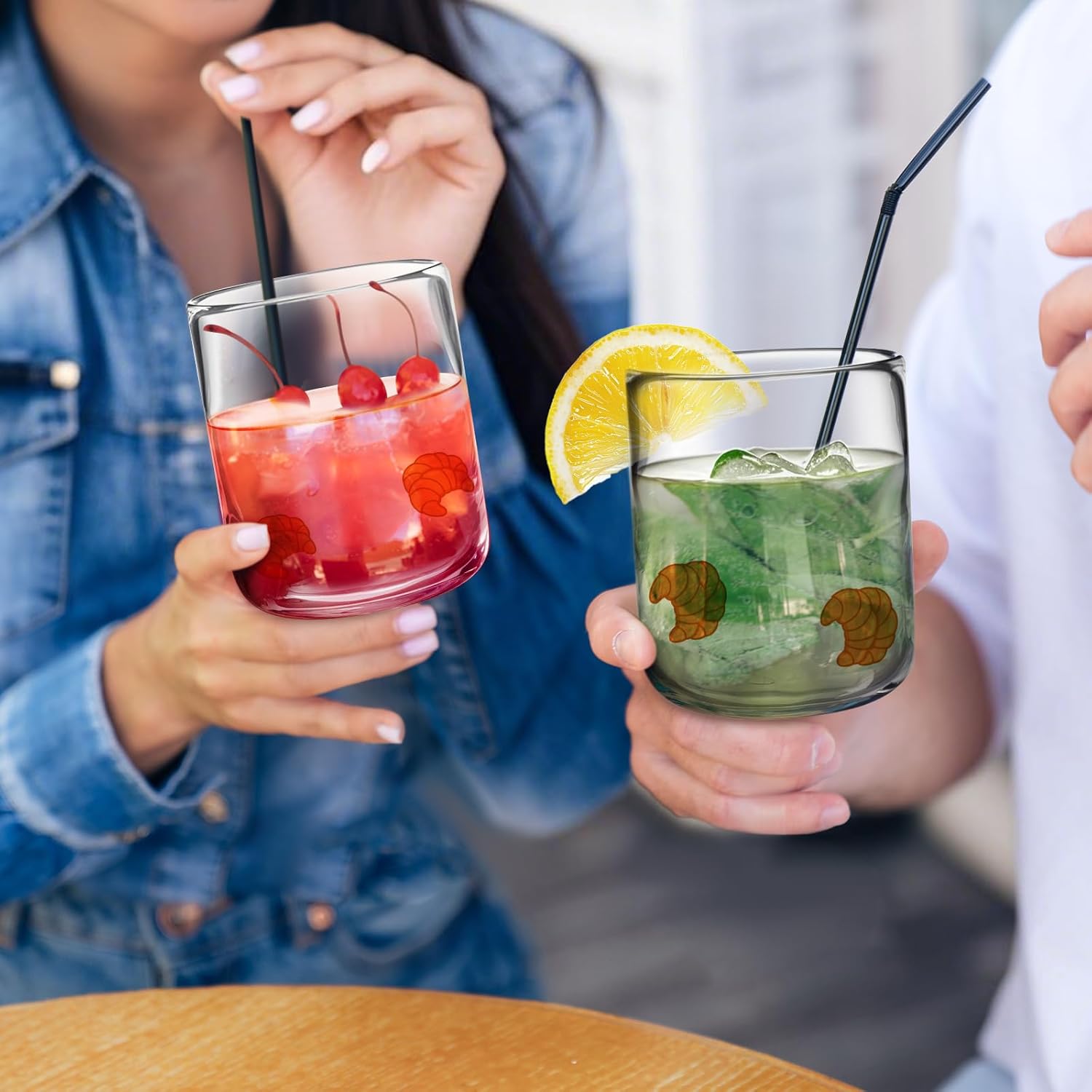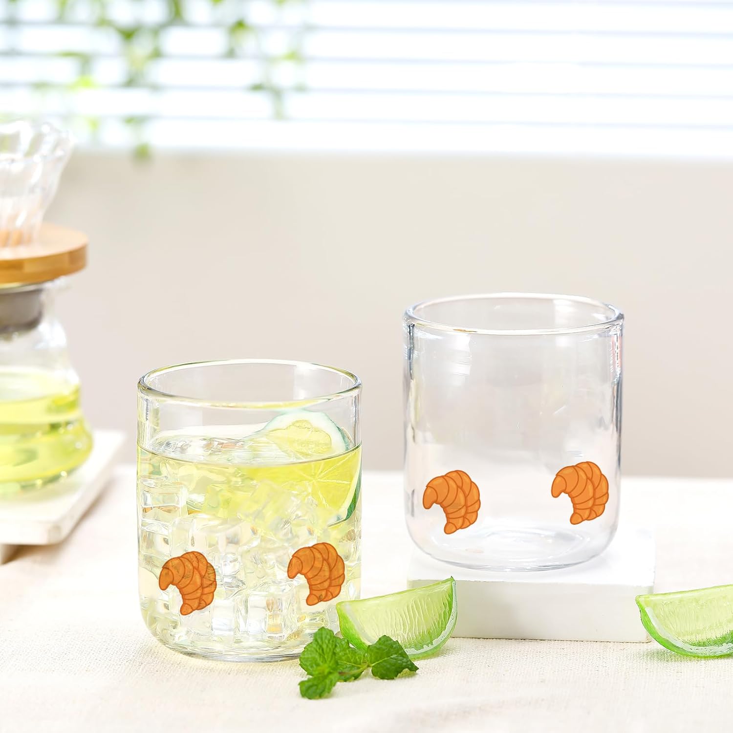 Funnymoom 2 PCS Icon Juice Glasses - 14oz Double Old Fashioned Icon Hand Blown Cocktail Cups Clear Stemless Wine Drinking Juice Glasses for Women Summer Sea Party Supplies Gift Feature: Enhances Decoration: These summer stemless wine glasses can also be displayed all year round as a delicate decoration to add an elegant touch to any table setting. Easy to clean: The stemless glasses material is easy to clean and does not easily leave stains. Specifications: Material: glass Color: clear Size: 3.5 inches x 4.3 inches (Diameter x Height) Package includes: 2 x Croissant Icon juice glasses Warm notes: Please allow slight errors in size due to manual measurement. Due to different angles of light and shadow effects, please allow a little color difference with the pattern.